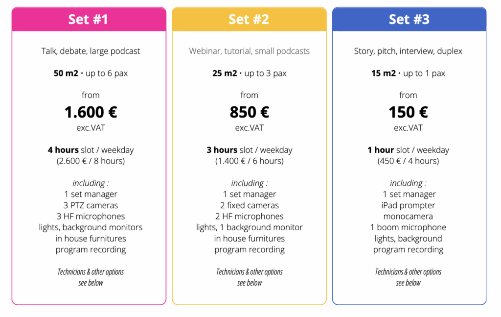 Talk & podcast (60m2), tutorial & duplex (40m2), facecam (15m2)